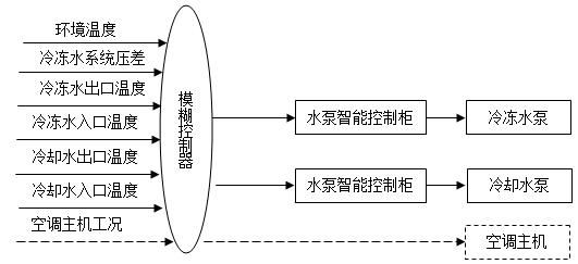 当中央空调系统负荷变化时,模糊控制器根据数据采集得到各种运行参数值,如系统供回水温度、供回水压差、流量及环境温度等,经推理运算后输出优化的控制参数值,对系统运行参数进行动态调整。